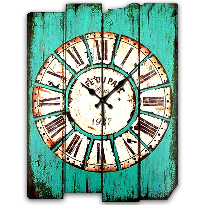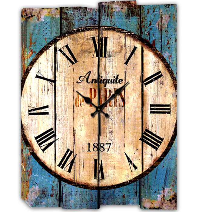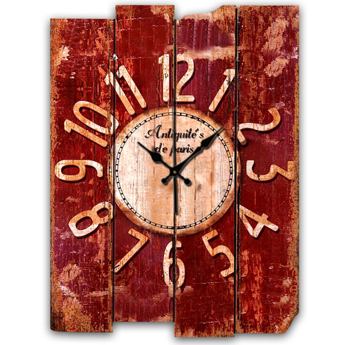 Reloj de pared estilo vintage, hecho en madera MDF de 06 cm de espesor, lámina adherida. Medidas 31x43 cm, máquina origen china, funciona con una pila AA no incluída.